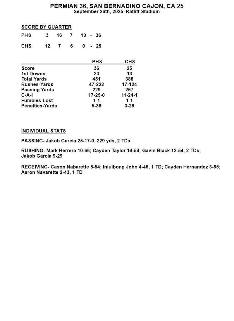 SEPTEMBER 26th- The Permian Panthers celebrated Homecoming with a 36-25 victory over the Cajon High School Cowboys from San Bernadino, California on Friday.