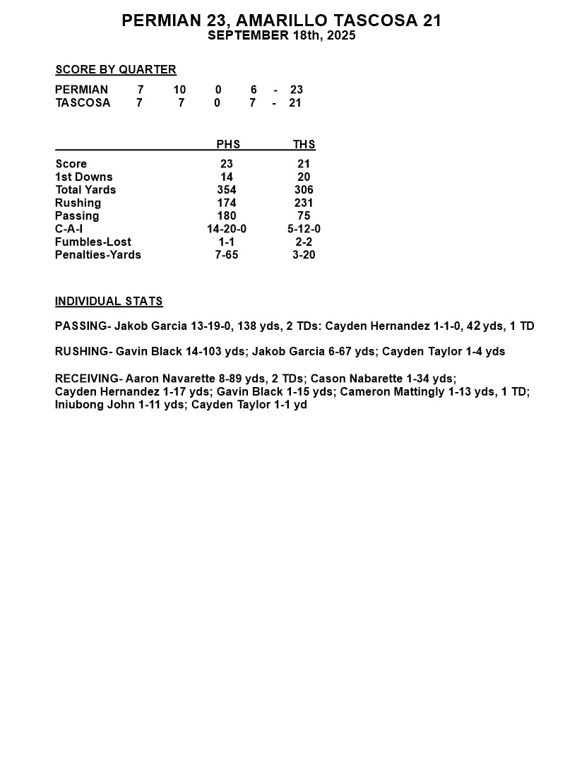 SEPTEMBER 18th- The Permian Panthers got out of Amarillo with a hard-fought 23-21 victory over the Tascosa Rebels on Thursday.